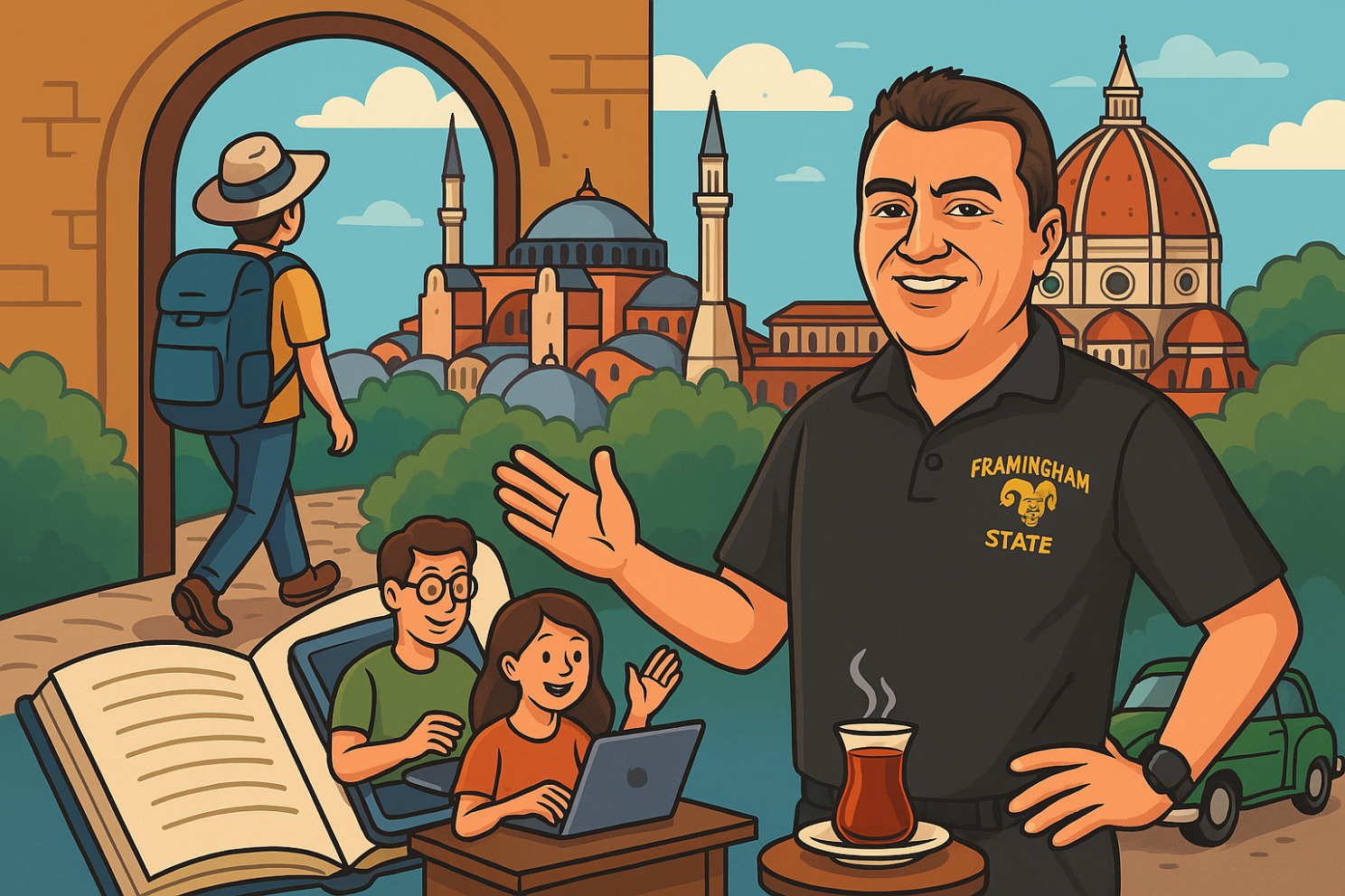 This AI-generated illustration captures moments from Dr. Palabiyik's interview, where he shares how he teaches students the hospitality mindset—drawing on rich experiences from Florence, Istanbul, and Cuba. A visual journey through learning, culture, and the transformative power of travel.